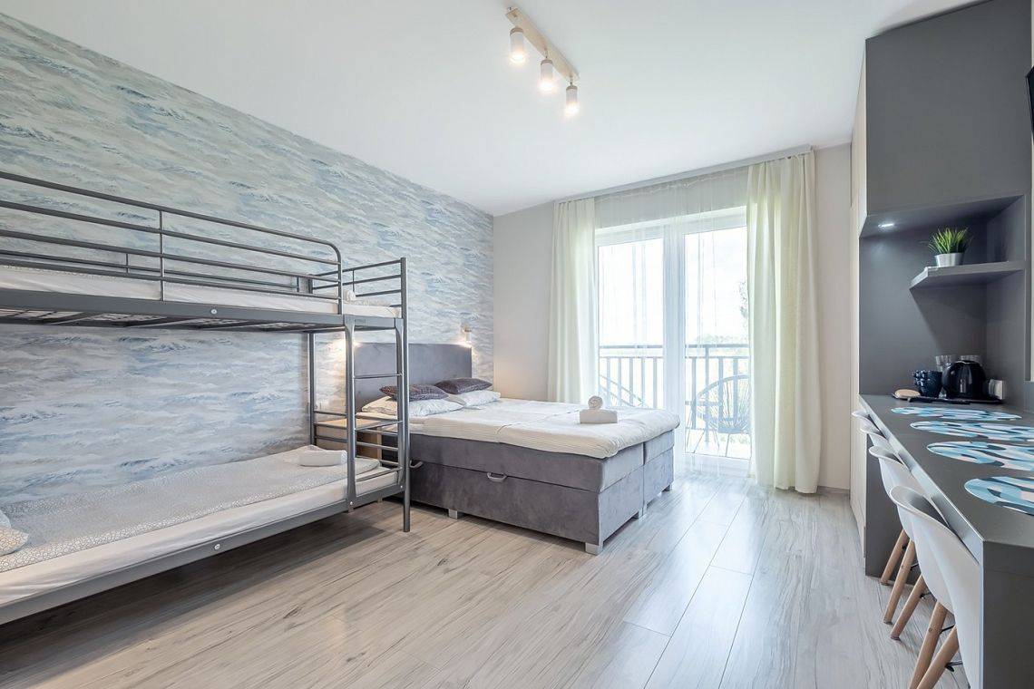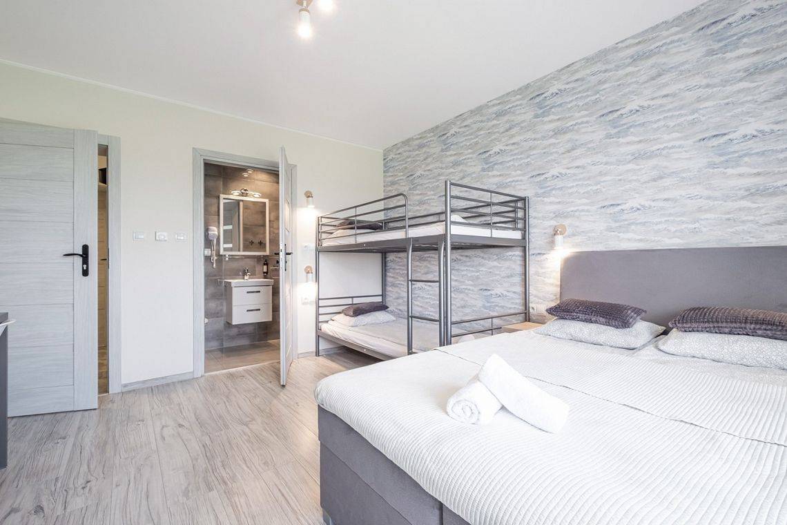 W pokoju czteroosobowym znajduje się łóżko kontynentalne dwuosobowe (140x200 cm) oraz jedno łóżko piętrowe.