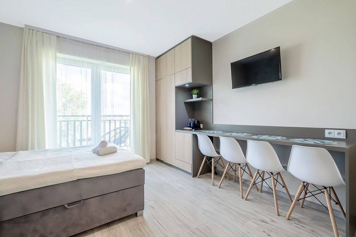 Na balkonie znajduje się zestaw wypoczynkowy, dodatkowo z części pokoi rozciąga się widok na łąki oraz las.