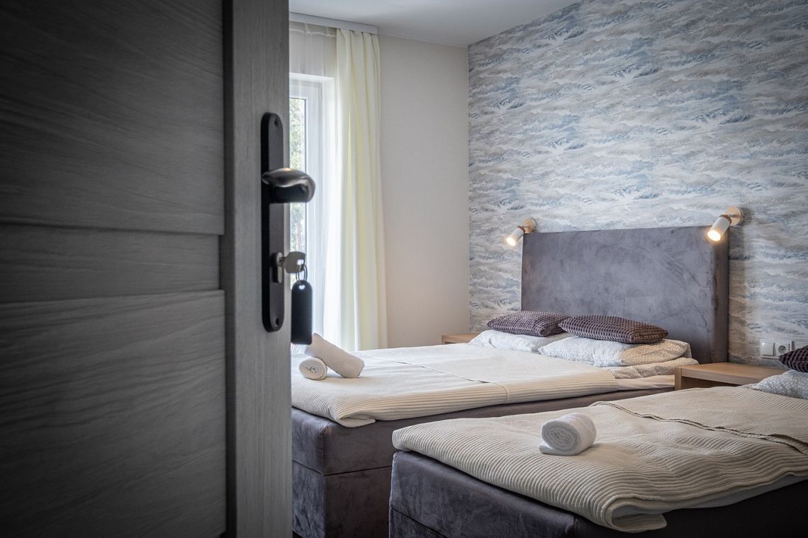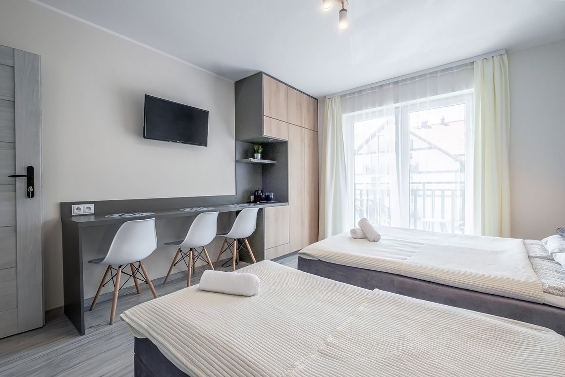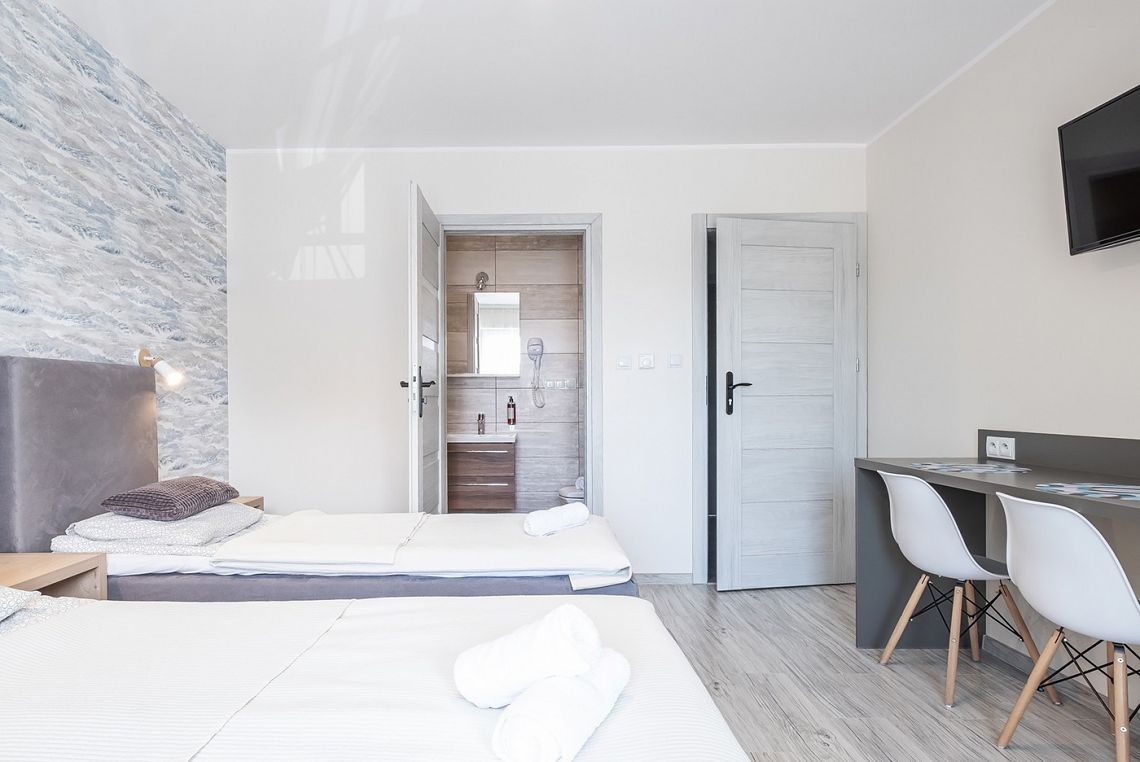 Jasny, urządzony w nowoczesnym, hotelowym stylu pokój. Dla Państwa komfortu w pokoju znajduje się klimatyzacja ścienna.